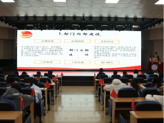 随着团歌响起,大会开始。团委、校学生会各部门对本学期工作进行总结交流并对下学期工作作出展望。各部门代表依次上台进行期末工作总结汇报,介绍了本学期的常规工作、特色活动以及工作中存在的问题和后续改进措施,为下学期工作打下良好基础。