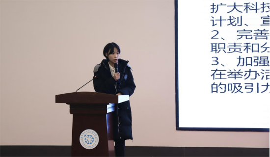 接着,马瑶回顾本学期的各项工作,鼓励大家善于发现问题、解决问题,开展有意义的校园活动。同时,以身作则,严格要求自己,处理好工作和学习之间的关系,发挥榜样力量,在同学中起到模范带头作用。