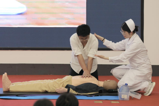 最后,志愿者焦永亮上台,将所学的心肺复苏术进行演练。姚雪梅及时纠正错误,对容易忽视的细节进行提醒,确保当意外真正发生时,每个人都能做到“敢救、会救、能救”。