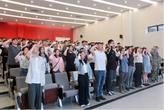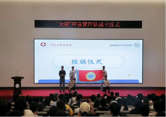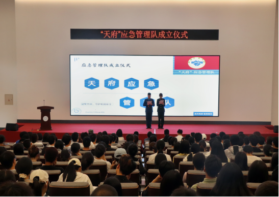 最后,严飞雷将队旗授予应急管理队的队旗授予应急管理队,王鎏洋带领在场师生宣誓。此次应急管理队的成立,不仅体现了学校对于应对突发事件的重视,也为师生们的安全提供了有力保障。未来,“天府”应急管理队将秉承“崇文尚武,敏思践行”的校训,以专业的知识和技能,守护校园安全。