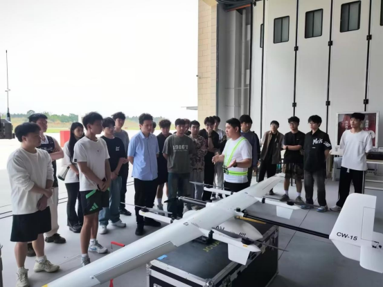 活动开始,张豪带领同学们参观了机场的航站楼、停机坪和跑道等区域,帮助同学们了解机场基本布局及运作流程。随后,大家来到无人机飞行区,观看无人机的起飞、巡航和降落等过程,同学们亲身感受了无人机技术的魅力。接着,张豪为同学们讲解了四川纵横无人机技术有限公司自主生产的CW-15、CW-25E等机型的各部件功能与其技术研发过程,让同学们对无人机应用技术有了更深刻的认识。