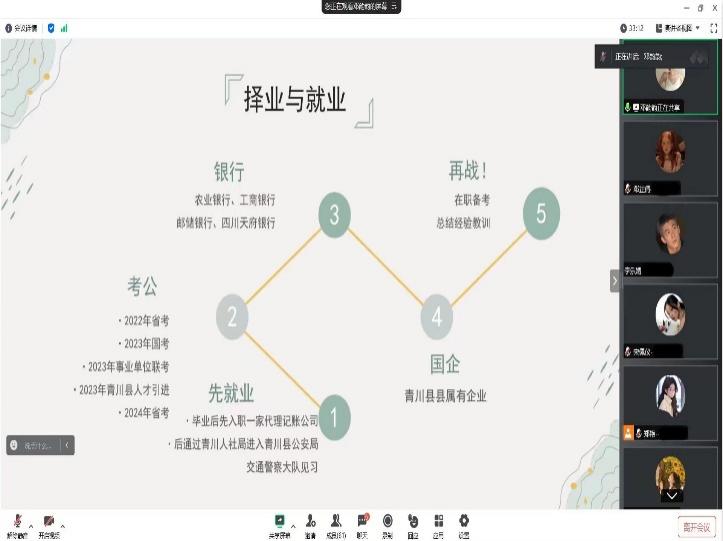 聆听青年声音,凝聚青春力量。为帮助同学们明确就业方向,规划就业未来,5月24日,会计学院(成都校区)党建办公室在线上会议组织开展“青年·创”系列活动之“生而逢盛世,青春正当时”——第六期党员开讲活动。
