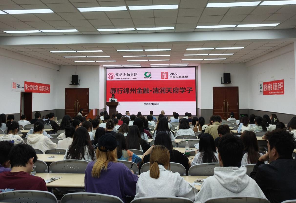 为进一步增强金融学子廉洁诚信意识,提修养、抓自律、守底线,智能金融学院团总支、学生会学术部联合学院第一党支部于6月6日在绵阳校区实验楼110教室举办了“廉行绵州金融,清润天府学子”活动。此次活动特别邀请到了中国人寿绵阳市分公司兰兵阳、喻蓉,中国人保财险绵阳市分公司理赔中心曾涛、顾丹主讲。国家金融监督管理总局绵阳监管分局纪委书记李均才、纪委办主任唐黔森;中国人寿绵阳市分公司纪委书记苗杰、纪委副书记崔璐、纪检员赵映东;中国人保财险绵阳市分公司纪委书记,副总经理肖龙、纪委办公室/法律合规部经理刘兴军以及智能金融学院党总支副书记张静共同参与了本次活动。