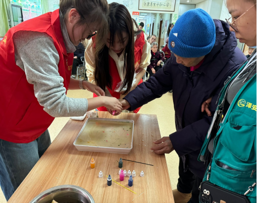 活动当日,志愿者们首先通过歌曲、舞蹈等文艺演出活动,活跃了现场气氛。每一个音符和动作都触动着老人们的心弦。随后,志愿者们又为老人们准备许多趣味小游戏,老人们相互比拼,玩的不亦乐乎。除此之外,志愿者们还精心准备了“水拓丝巾”活动,在学生们的帮助下,老人们亲手制作出一条条属于自己的独一无二的丝巾。活动的最后,志愿者与老人们进行了合影,记录了最美的瞬间,本次志愿服务活动也在一片欢声笑语中拉上帷幕。
