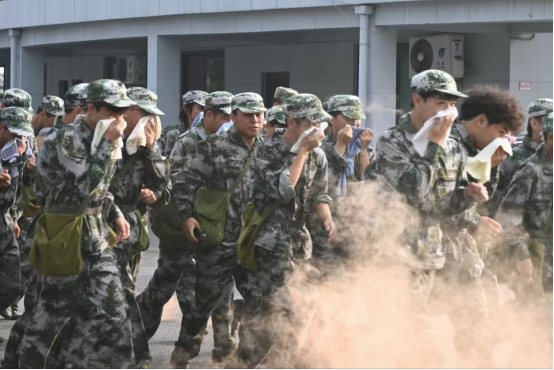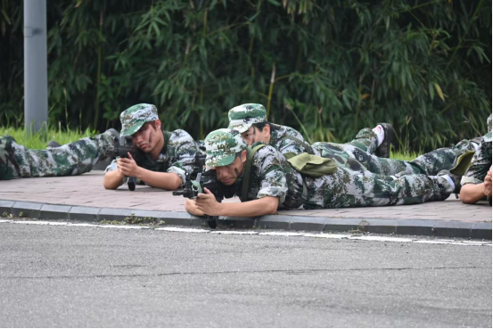 当队伍行进至预定地点时,演练正式开始。瞬间,烟雾弹腾空而起,浓浓的烟雾弥漫开来,为演练增添了几分紧张的气氛。同学们在烟雾中迅速反应,按照预定方案进行战术动作演练。他们或卧倒隐蔽,或冲锋向前,动作敏捷,配合默契。在侦察演练中,同学们充分发挥自己的观察力和判断力,仔细搜索周围环境,不放过任何一个可疑之处。同学们跑走结合,将连日来的军训成果尽情展现,出色地完成了拉练任务。