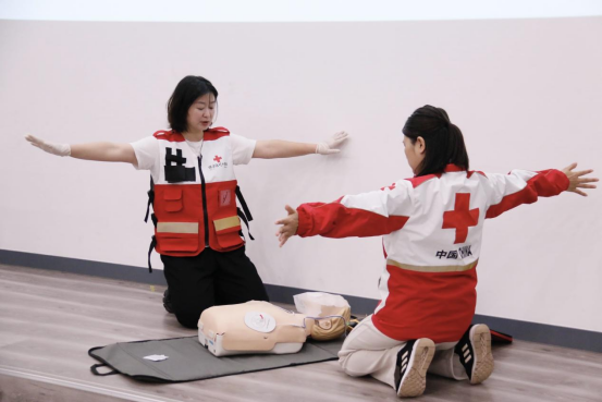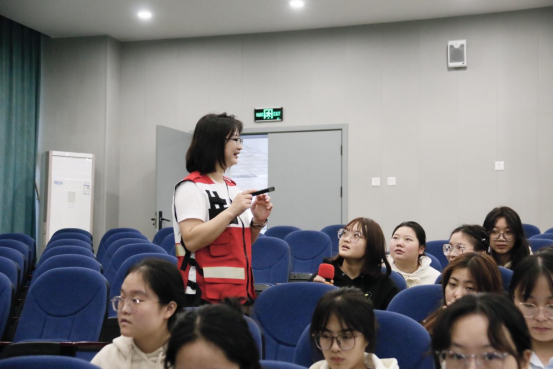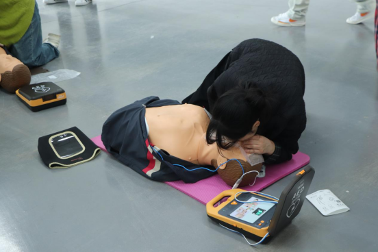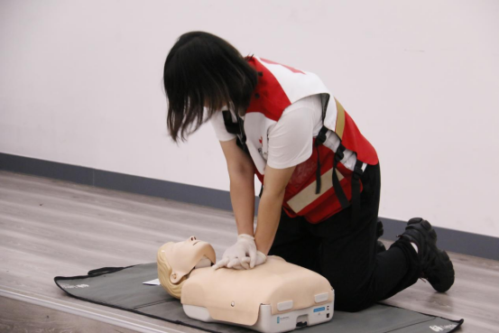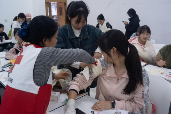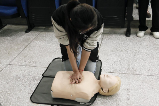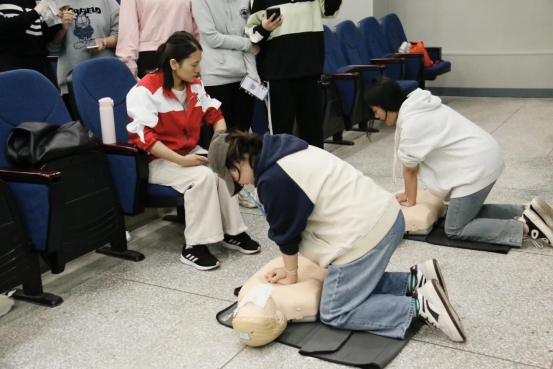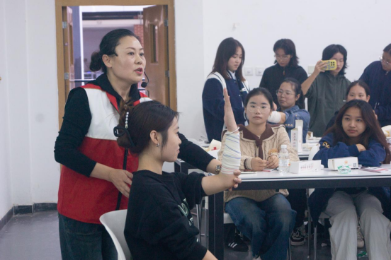 本次培训分为急救理论学习和实操演练两个方面。理论学习环节,讲师团队主要从红十字文化与救护概论、心肺复苏、气道异物梗阻、伤口处理、创伤包扎五个方面开展培训,老师们将真实案例与理论知识紧密结合,深入浅出地讲解了应急救护知识与相关技能。实操演练环节,培训老师为同学们现场演示了心肺复苏(CPR)、自动体外除颤器(AED)、不同部位受伤的包扎方法和骨折固定的实际操作方法。她强调:“在紧急情况下,依靠现场群众的快速响应与协同救助,对于挽救生命,为后续医疗救治赢得宝贵时间至关重要。”