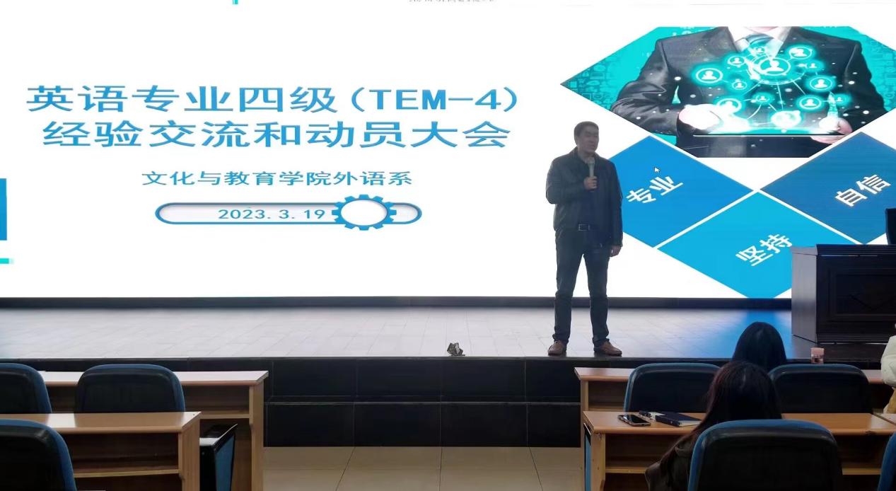 为了让同学们进一步了解英语专业四级考试,提高备考效率,文化与教育学院于2023年3月19日下午在学校学术报告厅举办了“英语专四经验交流和动员大会”。本次会议的嘉宾有文化与教育学院外语系主任周忠杰、英语教师李欣、辅导员郭兴玲、2020级优秀学生代表张仟、陈嫣然及全体2020级、2021级、2022级英语专业学生参与。