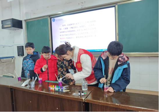 在“会变色的花”实验中,孩子们惊奇地看着白色的花朵在试剂的作用下逐渐变色,眼中满是对知识的渴望和对科学的敬畏。志愿者们一边操作,一边耐心解释背后的化学原理,让抽象的知识变得直观易懂。活动接近尾声,孩子们意犹未尽,志愿者与孩子们一同合影留念,记录下这充满欢笑与收获的时刻。