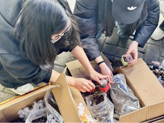 为践行劳动育人理念,树立绿色生态观念,活动特别设置"多肉领养工坊"。同学们有序排队,依次用双手完成了从“择盆”到“择苗”,再到“填土”的领养全过程劳动实践。领养多肉作为一项长期的劳动实践,将同学们的绿色生态理念外化于行,践行着劳动育人的使命,培育青年人更好地树立绿色生态理念,并投身于社会实践中。