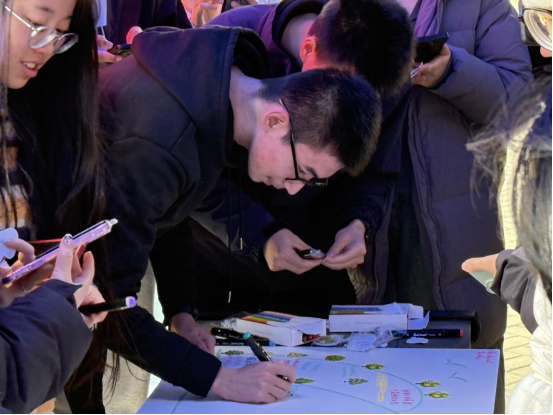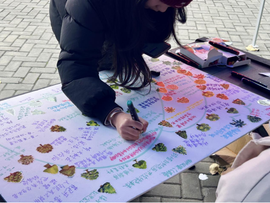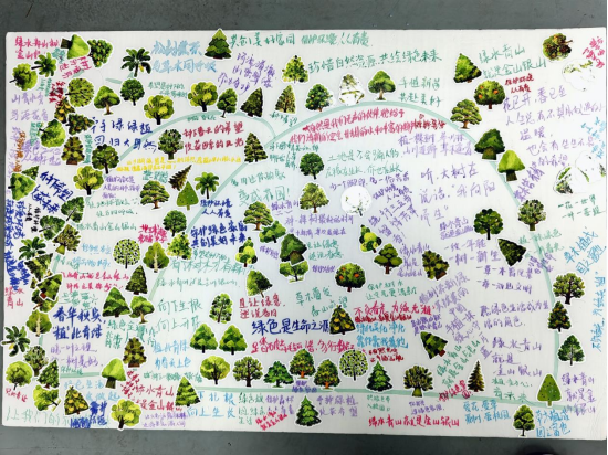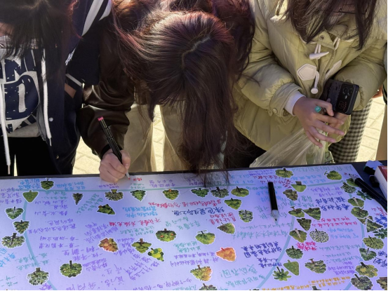 活动现场设置8块主题画板,参与者通过“树苗贴图+环保宣言书写”的形式,集体创作完成数幅长1.2米、宽0.7米的“生态画卷”作品。贴纸设计涵盖银杏、水杉等20种珍稀树种元素,直观展现生物多样性保护内涵。在工作人员指引下,同学们将自己的作品拍照上传至易班微社区平台,“植树节”“环保”相关话题累计收获1000余次互动讨论,形成线上线下融合传播矩阵,为绿色生态建设注入青春活力。