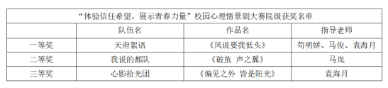 参赛剧目题材广泛,内容丰富。有的聚焦梦想,刻画主角在逐梦路上遭遇挫折却依旧坚守的动人瞬间;有的突出希望的力量,就像黑暗中的光,照亮前行方向;还有的围绕青春成长的烦恼,讲述从迷茫、挣扎到破茧成蝶的蜕变过程。每个剧目都紧扣大赛主题,情节跌宕起伏、环环相扣,蕴含深刻意义。舞台上,演员们用富有感染力的表演,将信任的力量、希望的美好和青春的蓬勃活力展现得淋漓尽致。他们把生活中常见的困境、内心的挣扎以及成功突破的喜悦真实呈现,让现场的评委和观众深刻感受到这些剧目中承载的青春迷茫与坚定。经过各个队伍的激烈比拼,此次大赛共评选出一等奖、二等奖、三等奖队伍各一支。