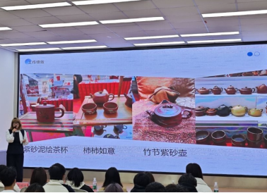 分享会上,8名学生代表依次登台,结合图文、视频等形式,生动讲述实践故事。首先,优秀学生代表范雨馨同学分享参与新加坡第32届“春城洋溢华夏情”文化、艺术、旅游展的志愿者服务经历。她在新加坡通过讲解紫砂壶制作技艺、表演敦煌飞天舞,带领国际友人沉浸式感受中华非遗文化魅力。一壶一舞间,传统文化与现代风采交融,赢得海外观众频频点赞,展现了新时代中国青年的文化自信。