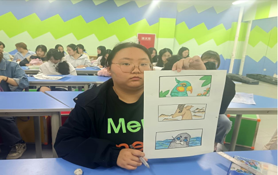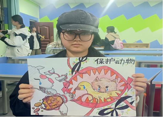 本次活动规则是需要在规定时间内完成各自的绘画作品,由工作人员进行计时。活动中,学生陈梦鑫的作品别具一格,她通过描绘不同动物的眼睛,引发对人类破坏自然行为的思考。这一创作构思新颖,内涵深刻。而苏芊曦同学的作品则色彩鲜明,画中无数红线象征着人类的贪婪,它们将动物的眼泪紧紧束缚,而巨大的剪刀则寓意着人类有机会剪断贪婪,迈向多彩未来的希望。该作品生动展现了保护动物的重要性,传达出护佑生灵方能迎来希望的理念。活动最后,石倩老师对活动进行了总结发言,进一步加深了同学们对“护佑生灵,绘就希望”主题的理解。