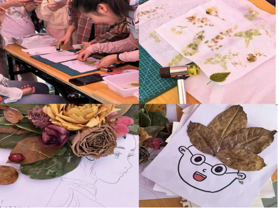 活动期间,同学们热情高涨。同学们在校园采集植物叶片、花朵,用染料在方巾上捶打拓染,创作出一幅幅独具特色的植物拓染作品,将自然之美晕染于方巾之上,用植物拓染留下春天的脉络与色彩;还以花为发,绘制了专属卡通表情包,在白纸上画出卡通表情包,再采集植物叶片粘贴在头顶作为卡通人物发型,留下了独属于春天的记忆。现场气氛热烈,大家发挥想象力,在创作中感受植物与艺术融合的魅力。