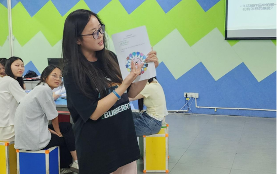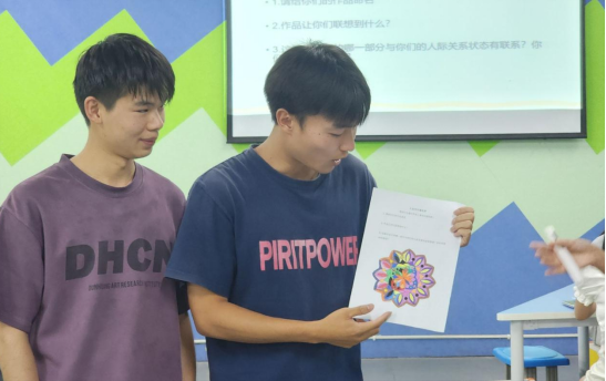 随后,进行了作画与展示活动。各组同学领取了“人际曼陀罗”的线稿,通过两两组合,共同上色。有的小组用暖色调描绘包容与温暖,有的则以对比色象征冲突与和解。填色完成后,在李敏老师的引导下,各个小组有序地讲解了填色的创作理念,展示了同学们心中对人际交往的独特视角,表达了对人际关系的理解。