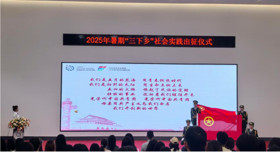 活动中,各实践队伍还集体朗读了《安全承诺书》,郑重承诺在实践期间严格遵守国家法律法规和学校纪律,服从团队安排,确保自身安全。随后,举行了授旗仪式,校领导为各实践队伍授旗,象征着责任与使命的旗帜在学子们手中高高飘扬,激励着大家在实践中勇往直前。