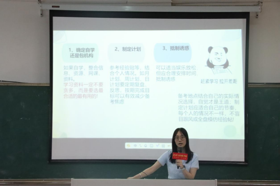 会议伊始,苟明娇对三位分享同学的优秀成绩表示肯定,并强调本次分享会旨在为同学们搭建交流平台,让大家从学长学姐的实战经验中汲取智慧,从现在做起,学好专业知识,掌握备考技巧。