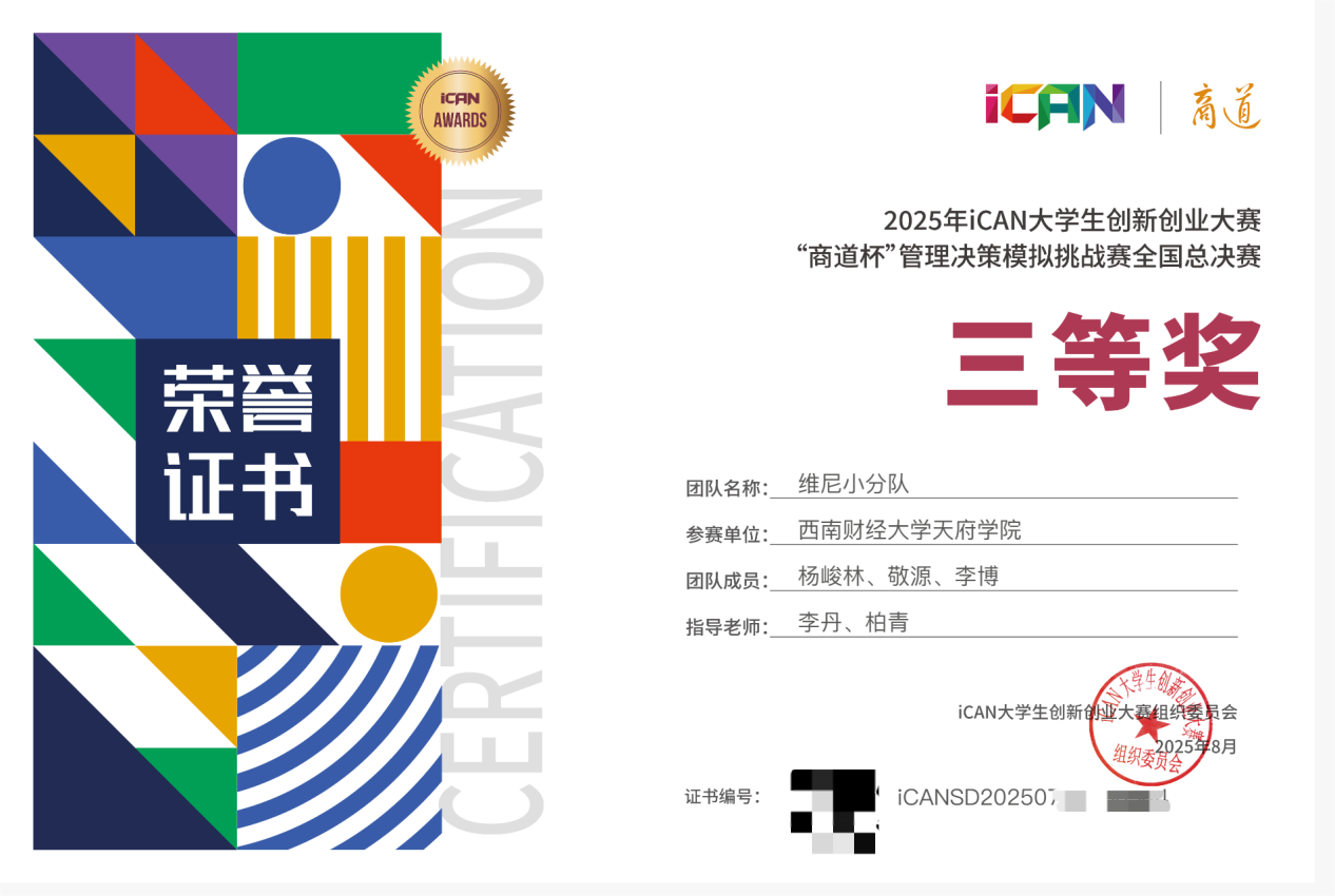 近日,2025年iCAN大学生创新创业大赛“商道杯”管理决策模拟挑战赛落下帷幕。该比赛由iCAN大学生创新创业大赛组织委员会主办,2023年列入中国高等教育学会发布的《全国普通高校大学生竞赛分析报告》竞赛目录【赛项序号54】,通过选拔,西财开云kaiyun体育会计学院及现代服务管理学院共16支队伍进入省赛,其中一支队伍晋级参加全国总决赛,最终荣获全国三等奖1项,省级一等奖1项,省级二等奖5项,省级三等奖8项,会计学院杨益、杨卓、李丹、柏青老师荣获省级优秀指导老师。