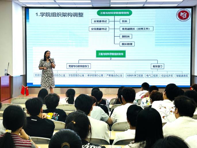 为助力新生开启学业征程,工程与材料学院举办“开学第一课”主题教育活动,为2025级新生扣好大学“第一粒扣子”。9月9日,学校在实验楼110举办“院长书记开学第一课”教育活动。院长周大利教授、分党委书记吴敏出席并发表讲话,围绕“新质生产力发展”与“青年责任担当”两大主题,为新生上了一堂兼具思想深度与时代温度的开学第一课。