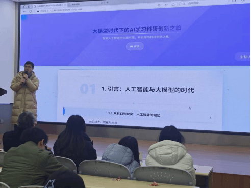 紧接着,农斌以饱满的热情为新生们献上了开班第一课——《大模型时代下的AI学习科研创新之旅》。他以其深厚的学术功底,深入浅出地剖析了人工智能领域的最新发展态势与科研创新的前沿方向。他不仅阐述了如何实现创新的方法论,还悉心指导大一学生应如何把握眼前的机遇,踏上AI科研与创新的征途。这堂课如同一把钥匙,为新生们打开了通往人工智能世界的大门,极大地激发了他们对这一领域的浓厚兴趣与无限热情。