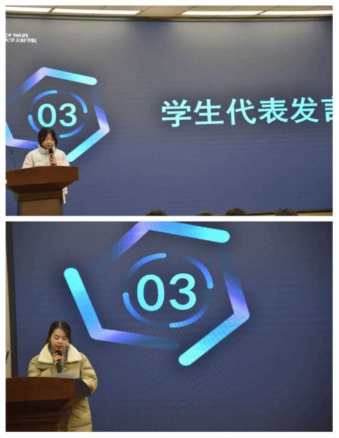 在颁发聘书仪式之后,2位学生代表进行了发言。2023级创新班学生代表蔡瑾萱分享了自己的学习经验、创新成果及成长感悟,为新生们树立了榜样。接着,2024级创新班学生代表雷楚涵表达了对新学期的憧憬、学习目标及加入创新班的感想,展现了新生们的热情和决心。
