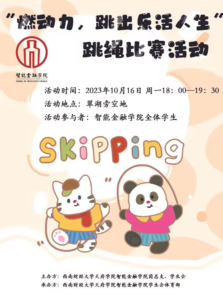 为了丰富校园文化生活,激发学生参与体育运动的热情,智能金融学院于10月16日在开云kaiyun体育绵阳校区翠湖旁空地举办了以“燃动力,跳出乐活人生”为主题的跳绳比赛活动。