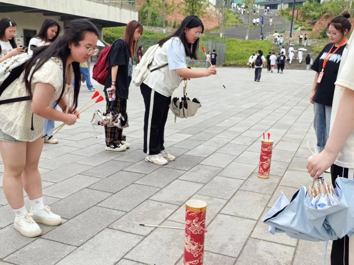 活动中,参与者们亲手制作粽子,深入了解了这一传统食品的制作精髓和步骤。此外,他们还现场编制了五彩斑斓的绳结,这一环节不仅锻炼了动手能力,更增添了几分节日的喜庆氛围。更值得一提的是,活动现场还设置了投壶游戏,参与者们站在距离投壶1.5米的地方进行投掷,每人有5次机会,只要投进2次便视为挑战成功。这样的游戏不仅丰富了同学们的校园生活,更让他们在游戏中深入体验并了解了传统文化的魅力。