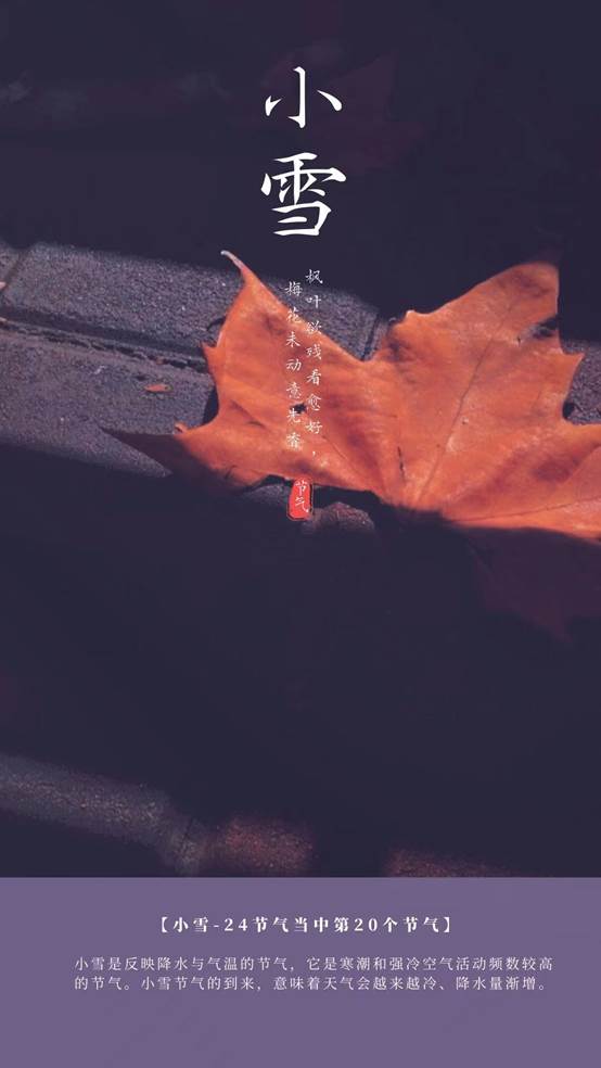 “小雪气寒而将雪矣,地寒未甚而雪未大也。”地寒为甚,气寒将雪。二十四节气讲述着光阴的故事,小雪是二十四个节气中的第二十个节气。它让我们告别了飒爽金秋,我们将走进一个白雪皑皑的冬天。