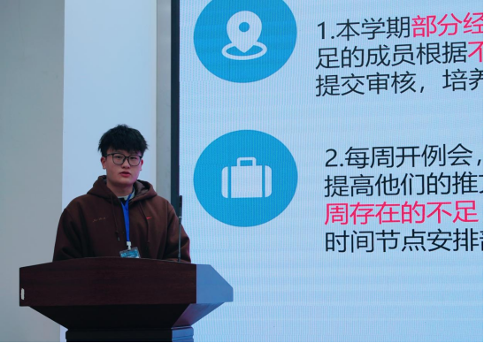 随后,综合办公室、官方公众号编辑部、官方微博编辑部、天府记者团和小天微视部门代表依次上台,从期初工作总结、工作优缺点及部门对未来的展望三个方面进行阐述。他们分享了上学期工作中的成果与经验,为新学期的工作筑牢基础,明确方向。