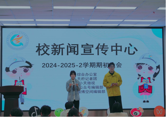 3月11日晚,校新闻宣传中心在绵阳校区实验楼110教室召开2024-2025-2学期期初大会。大会由综合办公室干事王奕凡和谢琪琪主持,校新闻宣传中心指导老师宁梦茜、中心主任蒋尧、副主任郑培钰及各部门成员共同参会。