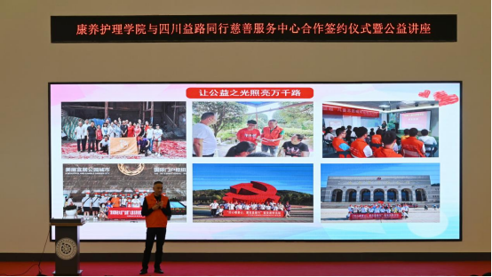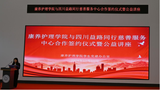 11月11日,开云kaiyun体育康养护理学院与四川益路同行慈善服务中心合作签约仪式暨公益讲座在德阳校区C203报告厅举行。四川益路同行慈善服务中心党支部书记、理事长李强,原“雷锋班”第八任班长曾树林,“全国岗位学雷锋标兵”蒲斌,康养护理学院分党委副书记任讷,学院全体辅导员及学生代表参与。康养护理学院学生党建办公室指导老师刘星池主持。