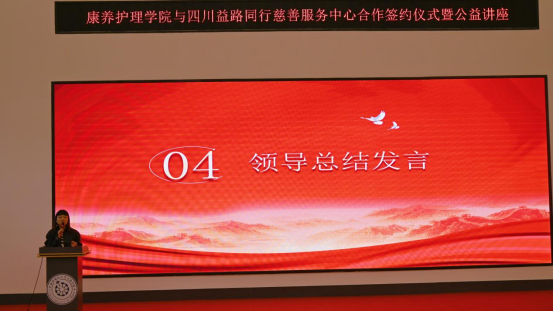 活动伊始,刘星池简要介绍活动嘉宾、活动背景和意义。她提到,康养护理学院一直致力于培养高素质的康养护理专业人才,为社会输送了大批优秀的护理工作者。四川益路同行慈善服务中心则在公益慈善领域积极开展各类活动,为弱势群体提供帮助和支持。此次合作将充分发挥双方优势,共同推动康养护理事业与公益慈善事业的融合发展。