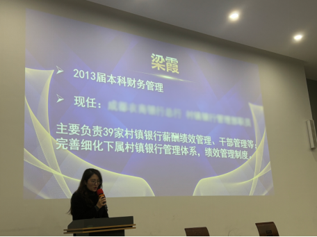 在校友分享环节,2013届本科财务管理专业校友梁霞首先登台发言,梁霞首先回顾了自己的大学生活,她鼓励学生们珍惜这段宝贵的时光,勤奋学习,深入掌握专业知识,为未来的职业生涯打下坚实的基础。接着她着重强调了职业规划的重要性,她提醒学生们在求职过程中要有清晰的自我认知,避免好高骛远,而应脚踏实地,选择与自己能力和兴趣相匹配的岗位,稳步发展职业生涯。最后,梁霞以职场前辈的身份,对即将步入社会的毕业生们提出了殷切期望。
