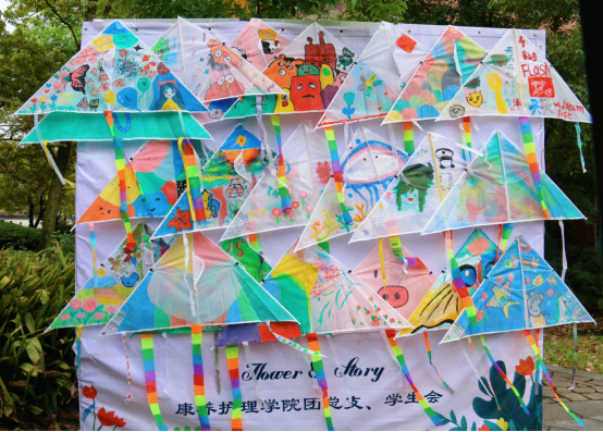 4月18日至19日中午,风筝在成都校区(东区)时代广场正式展出,同学们手绘的风筝悬挂在展板上进行了展示。