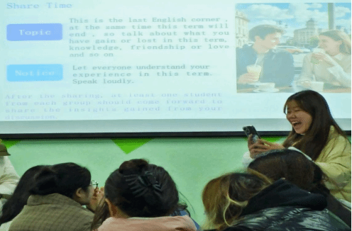 在前两个环节的有力加持下,主持人顺势将活动引入分享环节(Share time)。在这一环节里,主持人与工作人员纷纷深入到各个小组中,与同学们围坐在一起,耐心倾听同学们讲述,共同探讨个个有趣的话题,同时通过积极引导与鼓励,让每一位同学放下顾虑打开话匣子,尽情表达自己内心的想法。