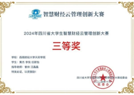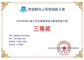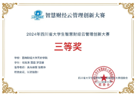 近日,2024年四川省大学生智慧财经云管理创新大赛圆满落幕。会计学院教师曾帅、杨卓指导的汪静雯、张渝欣、杨阳获得四川省二等奖;由吴尚帅薇、张晓华、曾帅、汪晶晶、余凤娟和冯恬甜分别指导的何龙涛、雷霞、罗羽蒙、黄杰、李悦、任新怡、马瑞、潘嘉利和熊闵获得四川省三等奖。