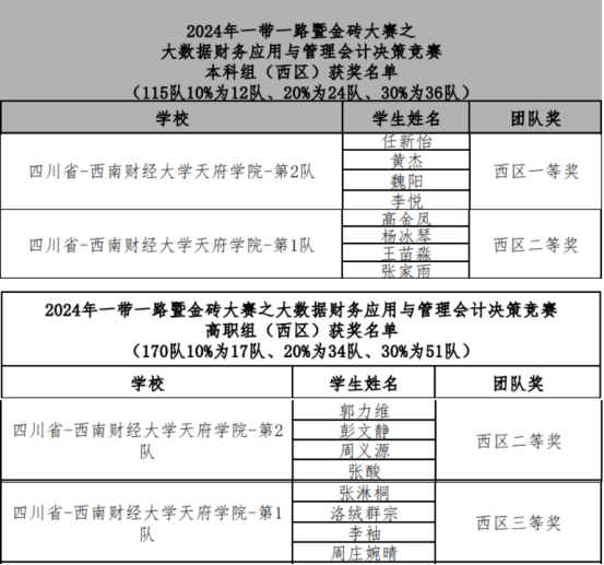 2024年10月20日,由金砖国家工商理事会中方理事会、“一带一路”暨金砖国家技能发展国际联盟主办,金砖国家工商理事会(中方)技能发展工作组承办的2024年“一带一路”暨金砖国家技能发展与技术创新大赛大数据财务应用与管理会计决策赛项的区域赛落下帷幕。会计学院曾帅老师指导的学生任新怡、黄杰、魏阳、李悦获得了区域赛本科组一等奖;史卜宇老师指导的学生高金凤、杨冰琴、王苗淼、张家雨获得了区域赛本科组二等奖;柏青、范涤老师指导的学生郭力维、彭文静、周义源、张酸获得了区域赛高职组二等奖,柏青、范涤老师指导的学生张淋桐、洛绒群宗、李袖、周庄婉晴获得了区域赛高职组三等奖。本次赛事设有教师组,参赛形式为个人赛,会计学院教师曾帅、阮秋玲、赵淑芬参加了教师组的比赛,三人均取得了区域赛二等奖。