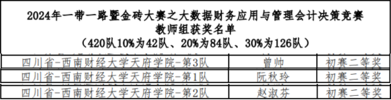 本次赛项分为大数据财务技能竞赛、管理会计技能竞赛两个环节,竞赛内容包括战略管理、预算管理、成本管理、投融资管理、运营管理、风险管理及python 语言的运用,对业财数据的提取、转换、分析等业务,同时涉及企业财务会计、智能化成本核算与管理、财务管理、管理会计、财务大数据分析等财会专业核心课程内容。该比赛从2024年7月开始启动,学生报名非常踊跃,校内选拔赛共有118支队伍共计463人参赛,选拔出学生16人组成4支代表队,教师3人参加区域选拔赛。最终,会计学院获得了一项区域赛一等奖、五项区域赛二等奖及一项区域赛三等奖,参加的队伍和个人均获得了奖项,并且有一支学生队伍和两位教师成功晋级全国总决赛。