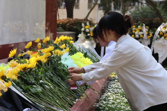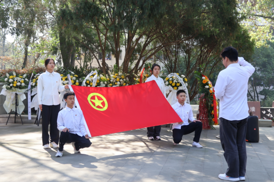 活动伊始,团学干部代表陈宏伟带领全体成员齐唱国歌并进行庄严宣誓,重温入团誓词,铭记历史使命,念先贤、祭英烈。在庄重宣誓后,全体师生肃立,为烈士默哀一分钟,愿逝去的忠骨安息于此,永享安宁。在深刻的追忆与思念中,在场师生重新打量生命的意义,感受时间的珍贵,继而慎终追远。追思后,师生轮流为公墓献花,表达深切的慰藉与无限的哀思。