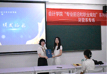 座谈会接近尾声,常莹代表会计学院财管系为高婧瑶颁发了行业导师证书,并期待优秀校友能够长期持续为同学们提供宝贵的行业指导和职业规划建议。