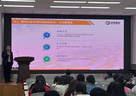 张中云主要为同学们讲解期货市场环境及期货行业前景展望。首先以期货专业术语切入主题,再结合我国期货行业分析,指出我国期货市场人才紧缺的现状亟待改善。但在国家立法、扩大开放、政府鼓励下,期货行业市场环境也在持续优化,为我国发展注入新动能。张中云特别指出,期货从业资格证对同学们未来发展大有用途,希望大家积极参与期货从业资格证考试。詹娅书主要为大家讲解期货市场基础知识,通过展示期货合约实例引出此次讲座的重要内容,即期货市场基本制度、期货市场功能、期货市场交易特点。本次宣传讲座内容深入浅出,同学们对于期货知识有了更加深刻的了解。