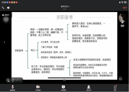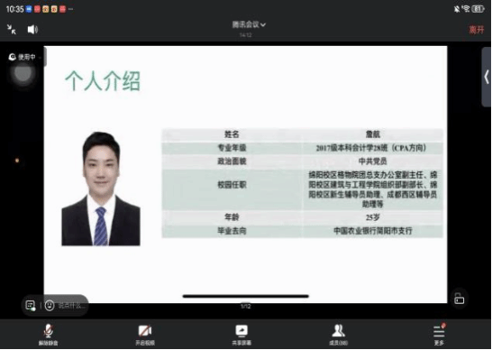 本次开讲活动邀请到了会计学院2017级优秀党员毕业生詹航为同学们做线上分享,其主要围绕“大学经历、入党初心、求职备考、银行工作”这四个方面向毕业班同学展开交流。会议中,詹航讲述了自己在大学时期的实践经历,强调这对于大学生未来的发展是尤为重要的,不仅可以锻炼自身,提升自我,还能为今后的职业发展备足强劲动力以及核心竞争力。