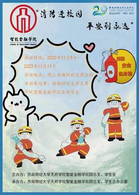 正值校庆来临之际,天气日渐寒冷干燥,火灾隐患大大增加,校园消防安全不可忽视。为进一步引导学生筑牢消防安全意识,守好校园安全防线,智能金融学院团总支、学生会于11月9日至11月11日开展了“消防进校园·平安到永远”安全教育主题活动。本次活动采用线上线下相结合的方式,或是鼓励同学们在校园内积极寻找消防器械,并学习其用法;或是描绘一幅幅栩栩灵动的画卷,落笔寄送自己饱含热情的感恩话语;或是孜孜求知消防安全的主题知识,提高消防意识。通过开展形式多样、内容丰富的消防主题活动,牢牢树立消防安全意识、维护安全稳定的校园环境。