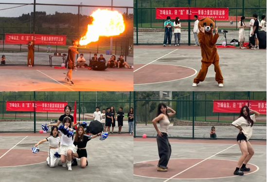 伴随着主持人的声音,联谊赛拉开帷幕。赛场上高悬醒目横幅,欢快的音乐在空中回荡,热情的舞蹈让气氛推向高潮,更有抛彩带、喷火表演等暖场节目。欢快悦耳的歌声和激情飞扬的舞蹈让篮球少年们鼓足干劲,以满腔热血迎接比赛的开始。