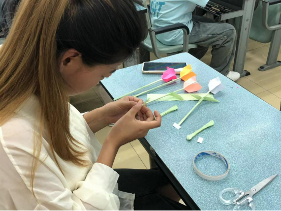 活动过程中,同学们充满热情,积极参与。他们或独立思考,或互相交流,用灵巧的双手将一张张彩纸折叠成一片片栩栩如生的花瓣。随着时间的推移,一朵朵色彩斑斓、栩栩如生的花朵在同学们的巧手中逐渐绽放,“以心传爱,笑绘温情”。