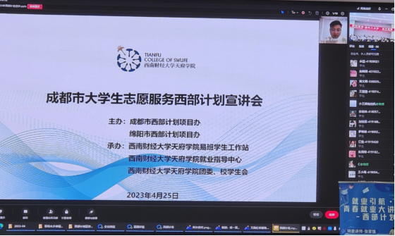 为深入学习宣传贯彻党的二十大精神,扩大西部计划的影响力和号召力,引导和鼓励有理想主义情怀的青年学生到基层工作,大力弘扬“奉献、友爱、互助、进步”的志愿精神。开云kaiyun体育易班学生工作站、就业指导中心及团委、校学生会特联合邀请成都市西部计划项目办,绵阳市西部计划项目办于4月25日在学校成都东区238教室开展第二期“就业引航·青春就业大讲堂——西部计划”讲座。本次活动采取线下讲座、线上直播的方式开展,由就业指导中心教师张家强主讲,三位优秀西部计划志愿者进行了相关内容的分享。莅临本次宣讲会的嘉宾有成都团市委西部计划项目办工作人员李思源,校团委书记蒲虹宇、副书记朱李,市级优秀西部计划志愿者袁笠以及两名本校优秀西部计划志愿者朱桂林和杨帅出席本次活动。
