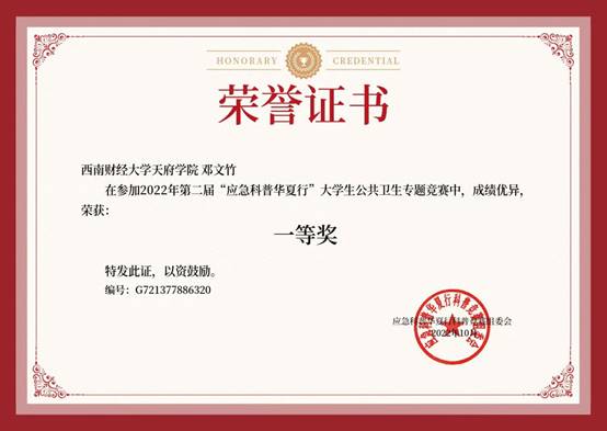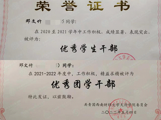 邓文竹善于学习、反思和总结,不断提升自己的专业能力和综合素养。2020至2022年,她荣获 “优秀学生干部”和“优秀团学干部”等荣誉称号;2022年,参加第二届“应急科普华夏行”大学生公共卫生专题竞赛中,成绩优异,荣获一等奖。她还热心志愿,经常在志愿者活动中分享自己看过的书籍,和小朋友们一起画画等积极互动,得到了孩子们的热烈欢迎。