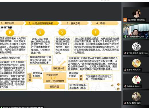 本次比赛从10月-11月持续展开,10月15日,初赛是通过学习通答题,考核内容为管理会计与财务会计,共232名同学参赛,最终50名同学进入复赛。复赛同学分为10组,每组5人,进行“清洁光伏的增本降效之路”案例分析。同学们在指导老师的悉心指导下完成复赛事项的培训与准备工作,积极备战。10月28日,复赛通过线上提交小组案例分析PPT的形式,最终决出5支队伍。11月15日,决赛是在腾讯会议上进行,每组同学进行小组视频和案例分析展示后,评委老师进行提问和打分。经过激烈角逐,最终范涤老师指导的牟曼宁、鞠雪、李红、王梦雪、李媛媛五位同学获得本次决赛的一等奖,高敏老师指导的罗婉琳、尹瑶、张吕卓、王艺洁、张永杰和冯婷燕老师指导的李羽欣、陈璐、杨焱滨、杨颜嘉、裴修平等同学获得二等奖,李丹老师指导的邓朴岑、曾莎、钟宇、陈素华、袁珂珺和程倩老师指导的牟锌、李雨佳、吴春玲、段红波、李书裕等同学获得三等奖。至此,2022年秋季学期蒲公英会计技能大赛圆满落幕。