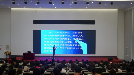 紧接着,孟建伟向学生简要介绍了文明冲突论。他表示,在网络信息传播技术飞速发展与普及应用的背景下,世界文化产品和文化观念的传播速度大幅提升。他还引用美国著名学者亨廷顿所著的《文明的冲突与世界秩序的重建》,进一步阐述了亨廷顿关于文明冲突的诸多观点。