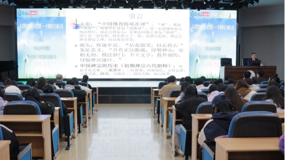 讲座伊始,纪华传为同学们讲述了禅宗的形成和影响:禅宗由印度传到中国,经过数年的发展演变,逐渐形成了具有中国特色的禅宗文化,奠定了中国佛教的基础。纪华传提到,禅学是心性之学,是生命的觉悟,中国佛教特质在禅,本质在禅,这是中国禅宗与印度禅宗之间最大的不同。